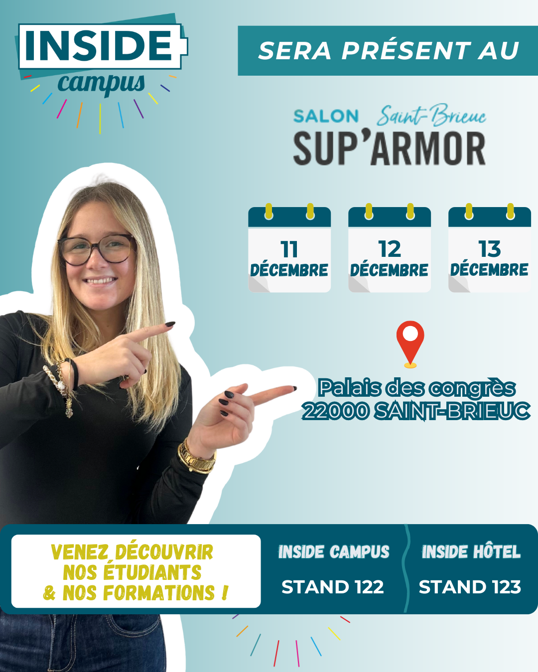 Les 11, 12 et 13 décembre, l’équipe d’Inside Campus et d’Inside Hôtel sera au Palais des Congrès pour échanger avec vous sur nos formations, nos parcours en alternance et la vie à l’école.